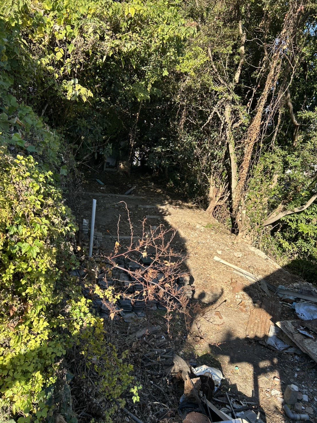 宅地は細い四角形型の土地で、草木がうっそうと茂っており、該当地付近はこう配や傾斜になっています。