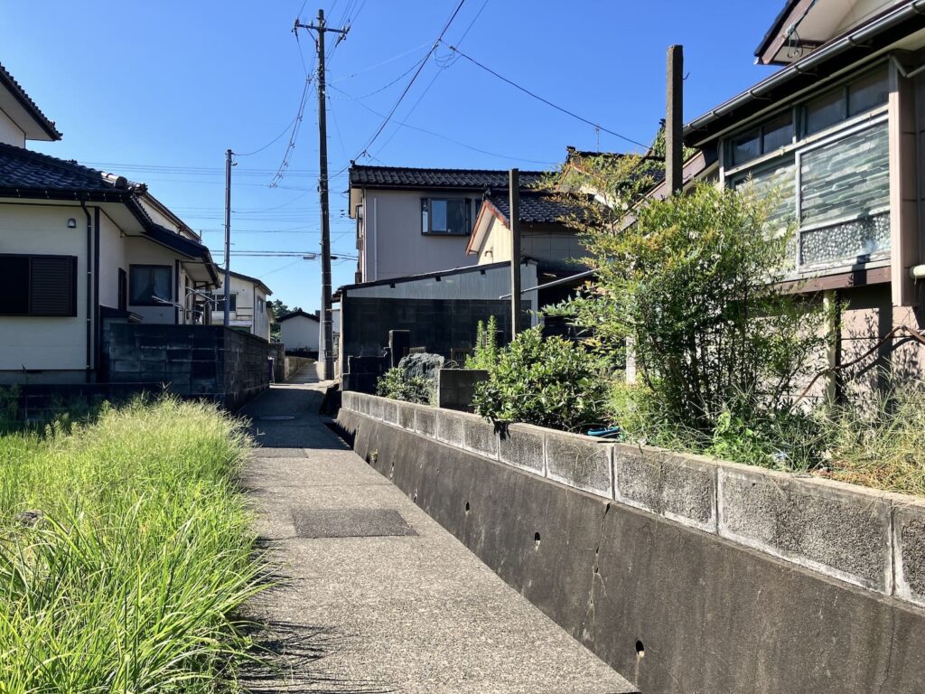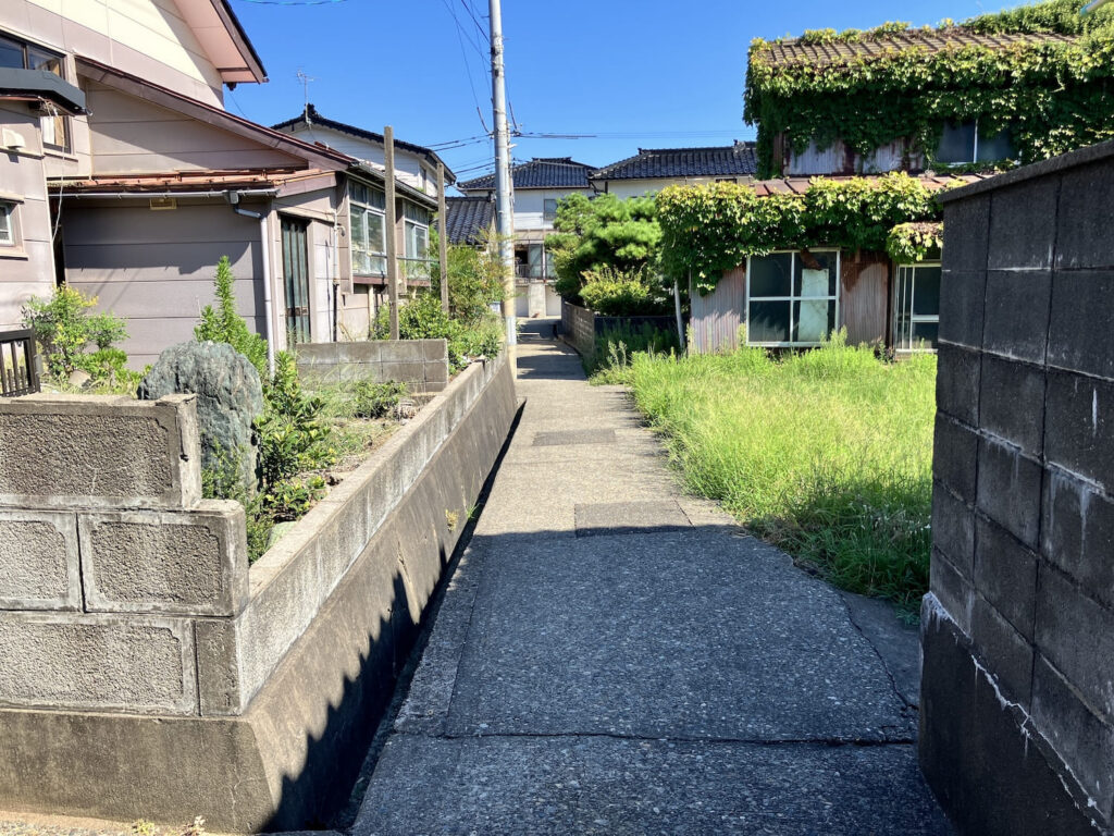 前面道路が狭く、軽トラックがギリギリ通行できる幅です。