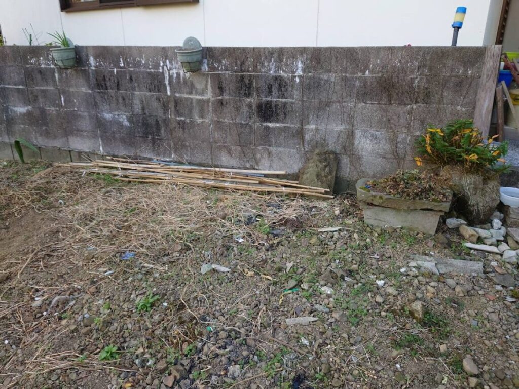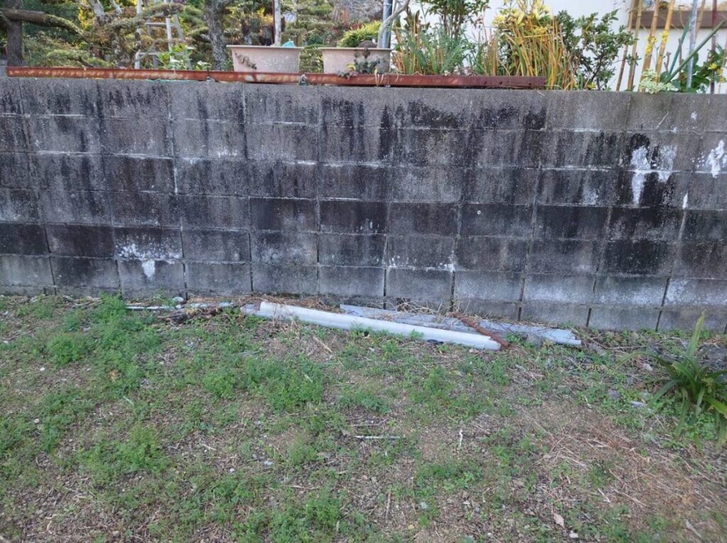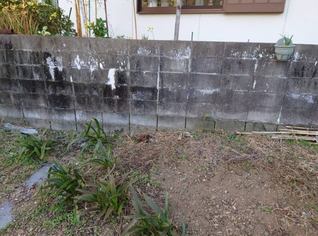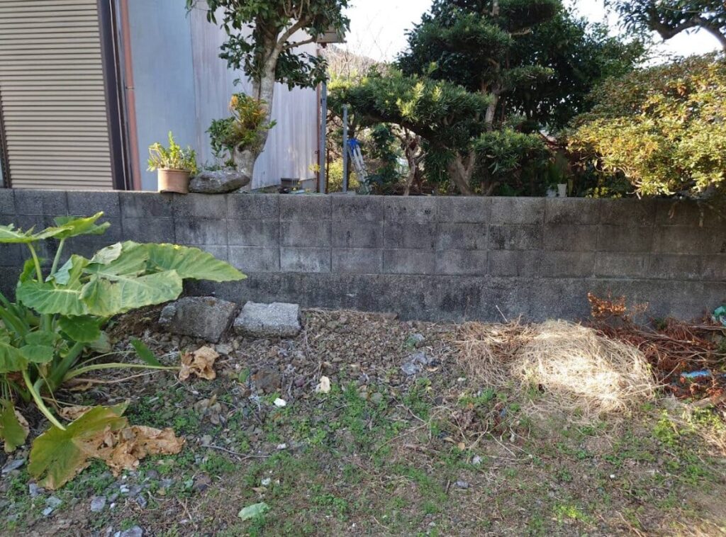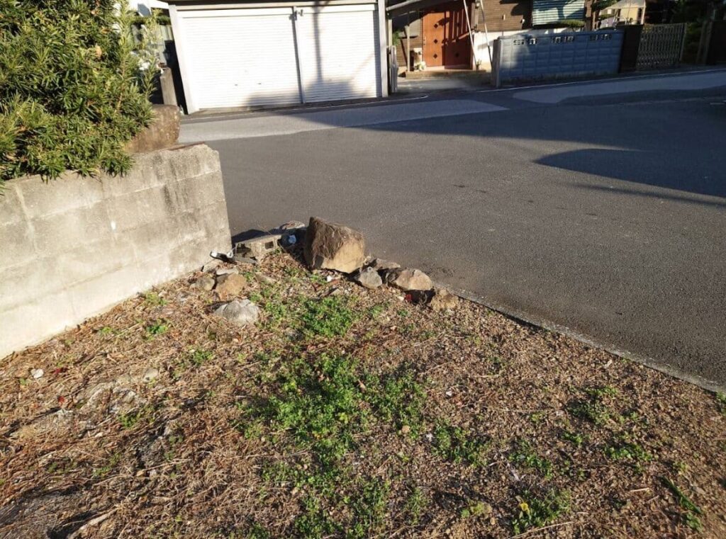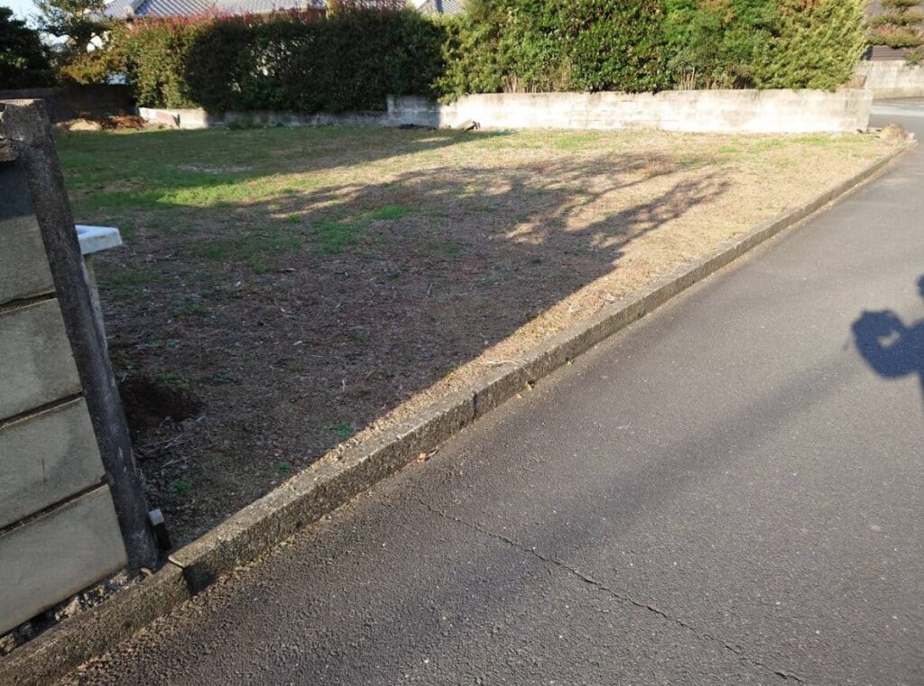 接道部分以外の三方向をコンクリートブロックに囲まれている四角い土地で、両隣には家が建っています。