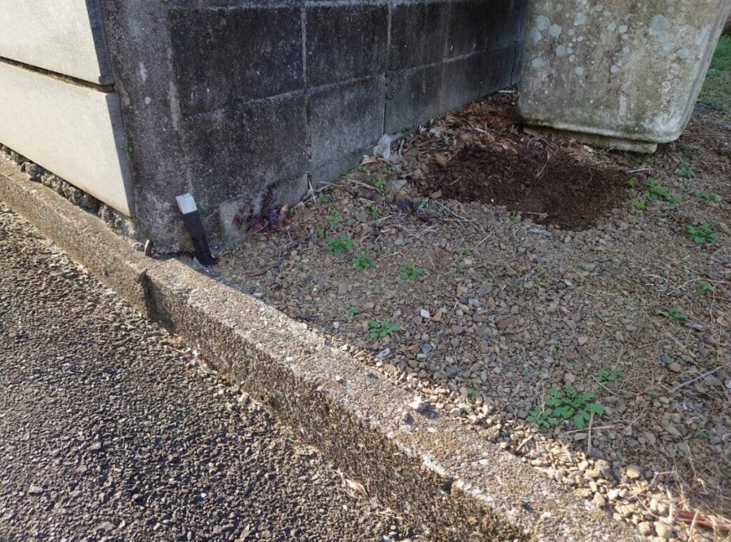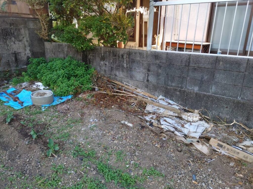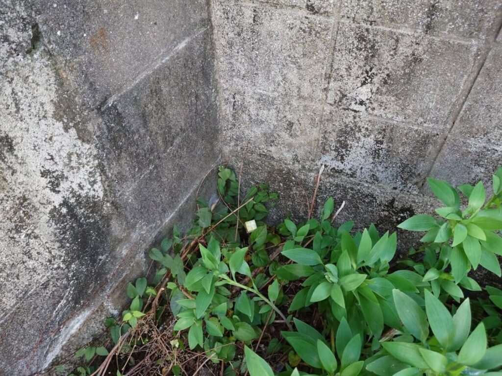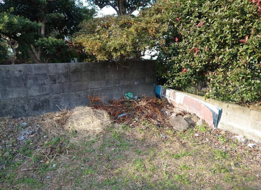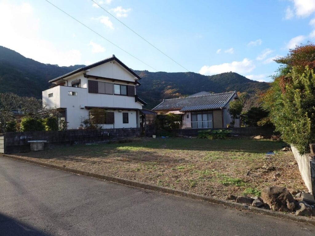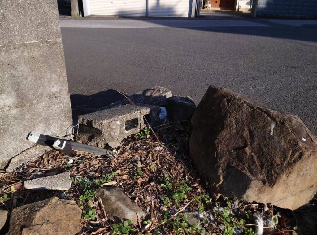 接道部分以外の三方向をコンクリートブロックに囲まれている四角い土地で、両隣には家が建っています。